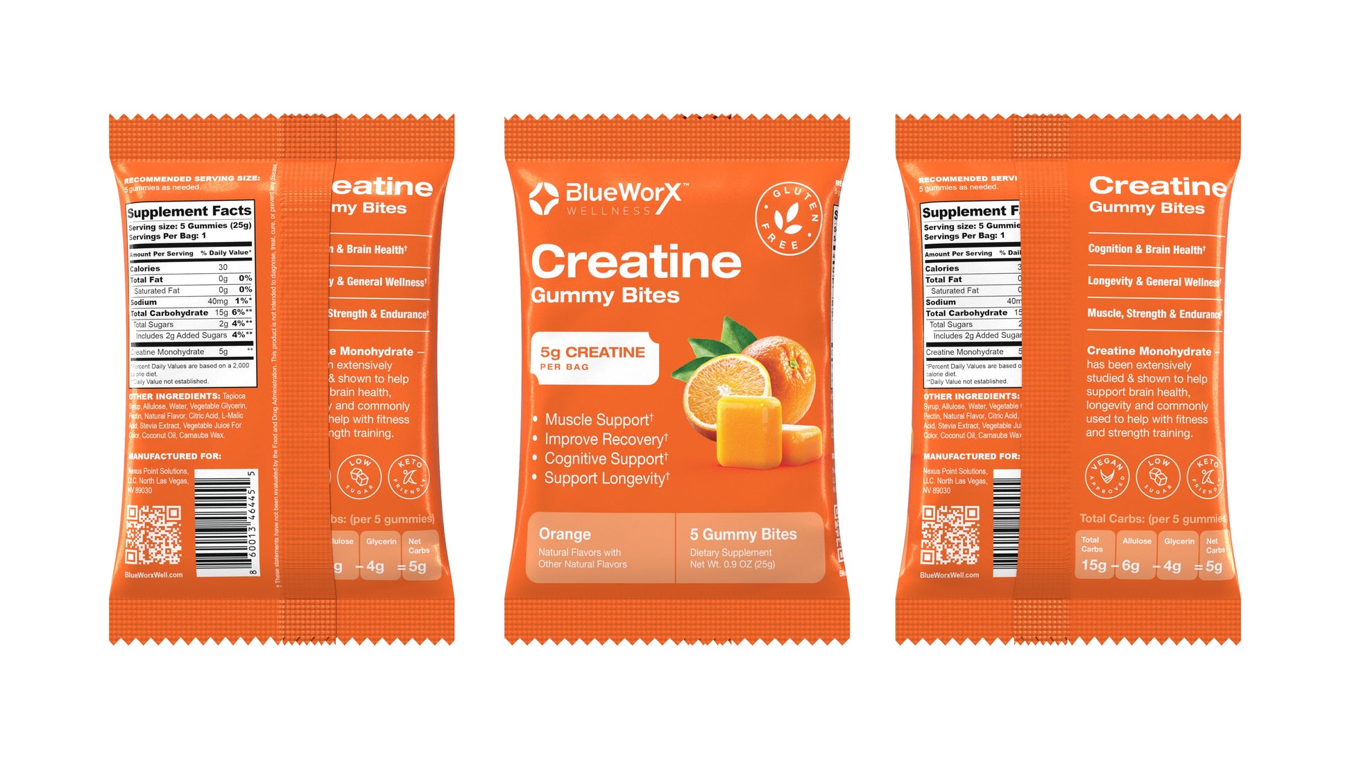 Each gummy delivers 1 gram of micronized creatine monohydrate, widely studied for its benefits in strength training, cognitive performance, and cellular longevity. These orange-flavored gummies are made with natural fruit and vegetable extracts (no artificial dyes), pectin-based (vegan), keto-friendly, and low in net carbs.