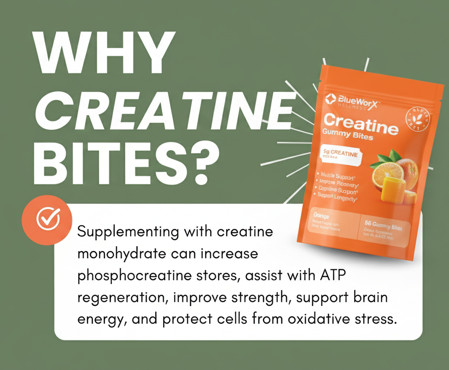 Fuel your muscles, boost recovery, and support brain health with Blueworx Creatine Gummy Bites—the tasty, low-sugar, vegan way to get your creatine.