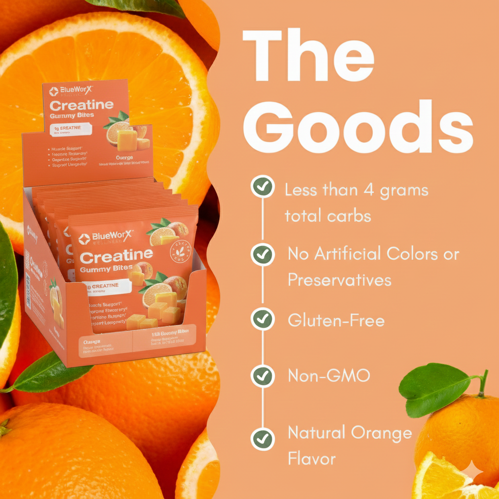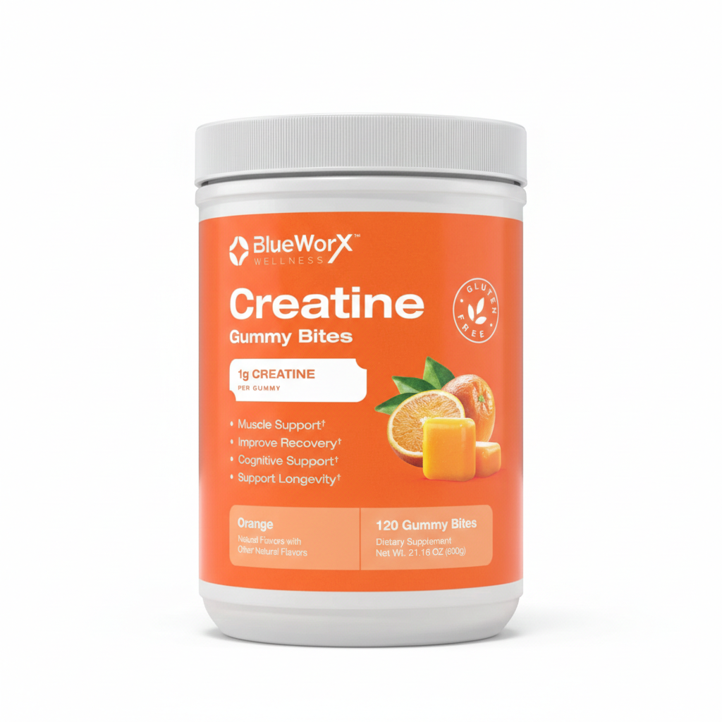 Forget the chalky powders and sugar-loaded drinks. Blueworx Creatine Gummy Bites deliver a clean, vegan form of creatine monohydrate—without the mess or artificial fillers. Each gummy is crafted for maximum absorption, convenience, and taste, making it easier than ever to power your workouts, boost recovery, and support brain performance.