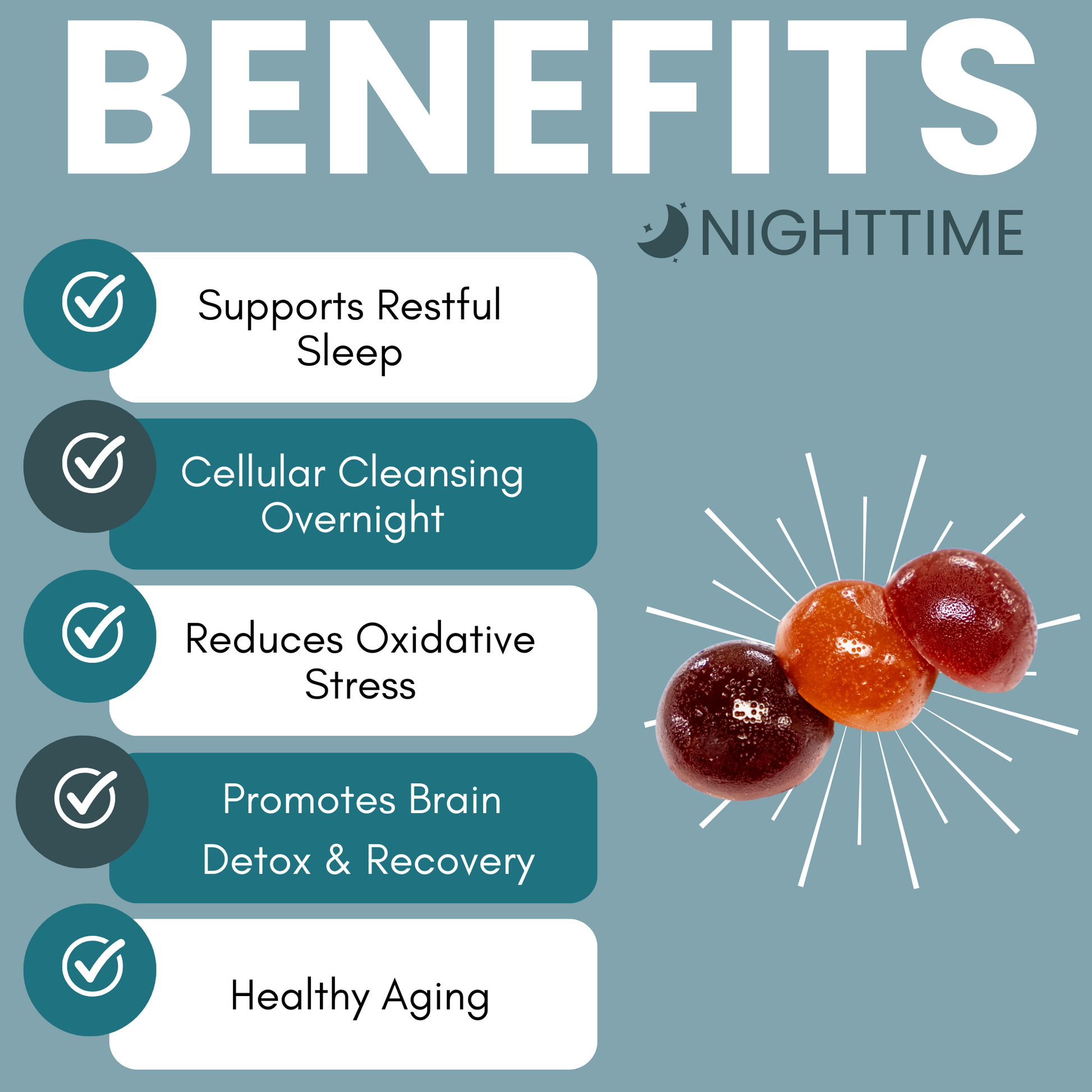 Nighttime: Supports restorative sleep, cellular cleansing, and recovery while you rest.