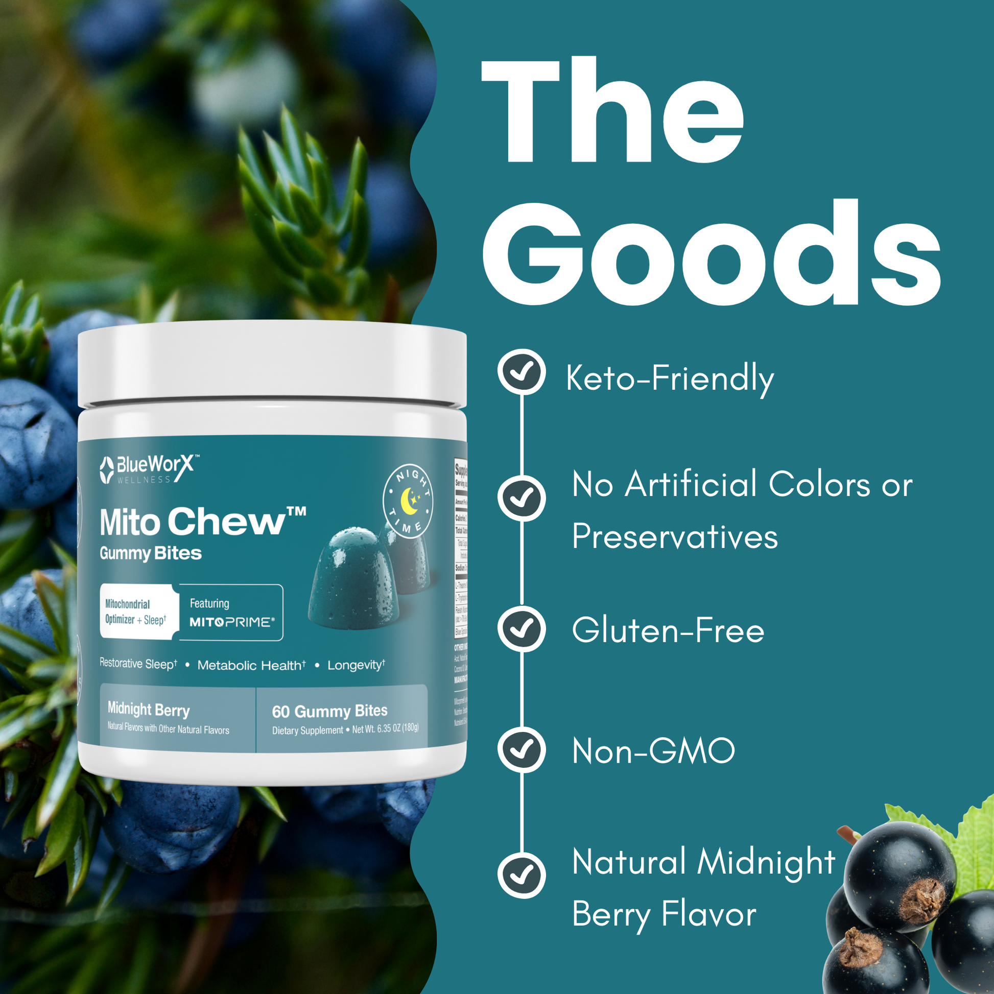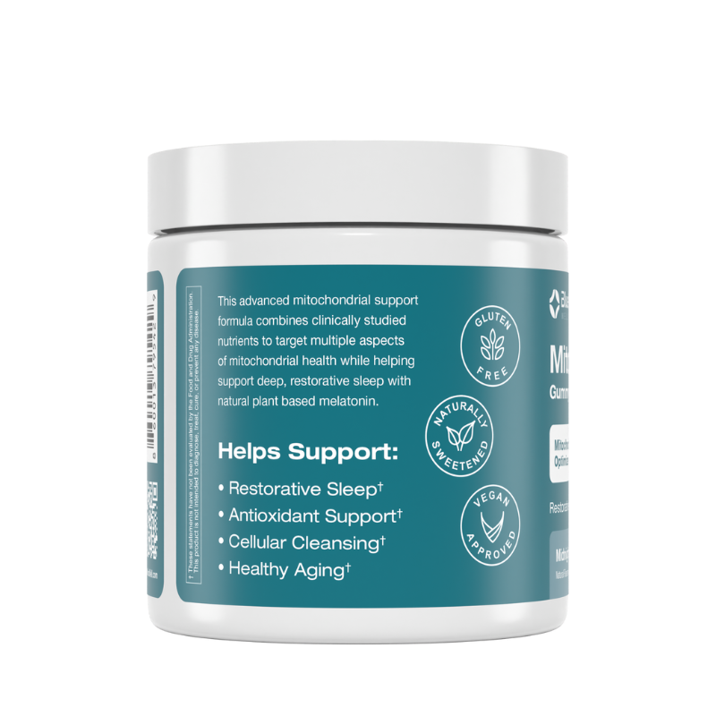 Recover while you rest. MitoChew™ Nighttime Gummy Bites are designed to support restorative sleep, cellular cleansing, and long-term vitality. With a powerhouse blend of mitochondrial nutrients, calming botanicals, and antioxidant support, these gummy bites help your body repair and rejuvenate while you sleep.