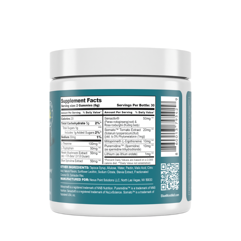 Each delicious midnight berry gummy combines L-Theanine, L-Tryptophan, Reishi Mushroom, Blue Spirulina, plant-based Melatonin, Spermidine, and more—working together to promote deeper sleep, brain detox, and healthier aging.