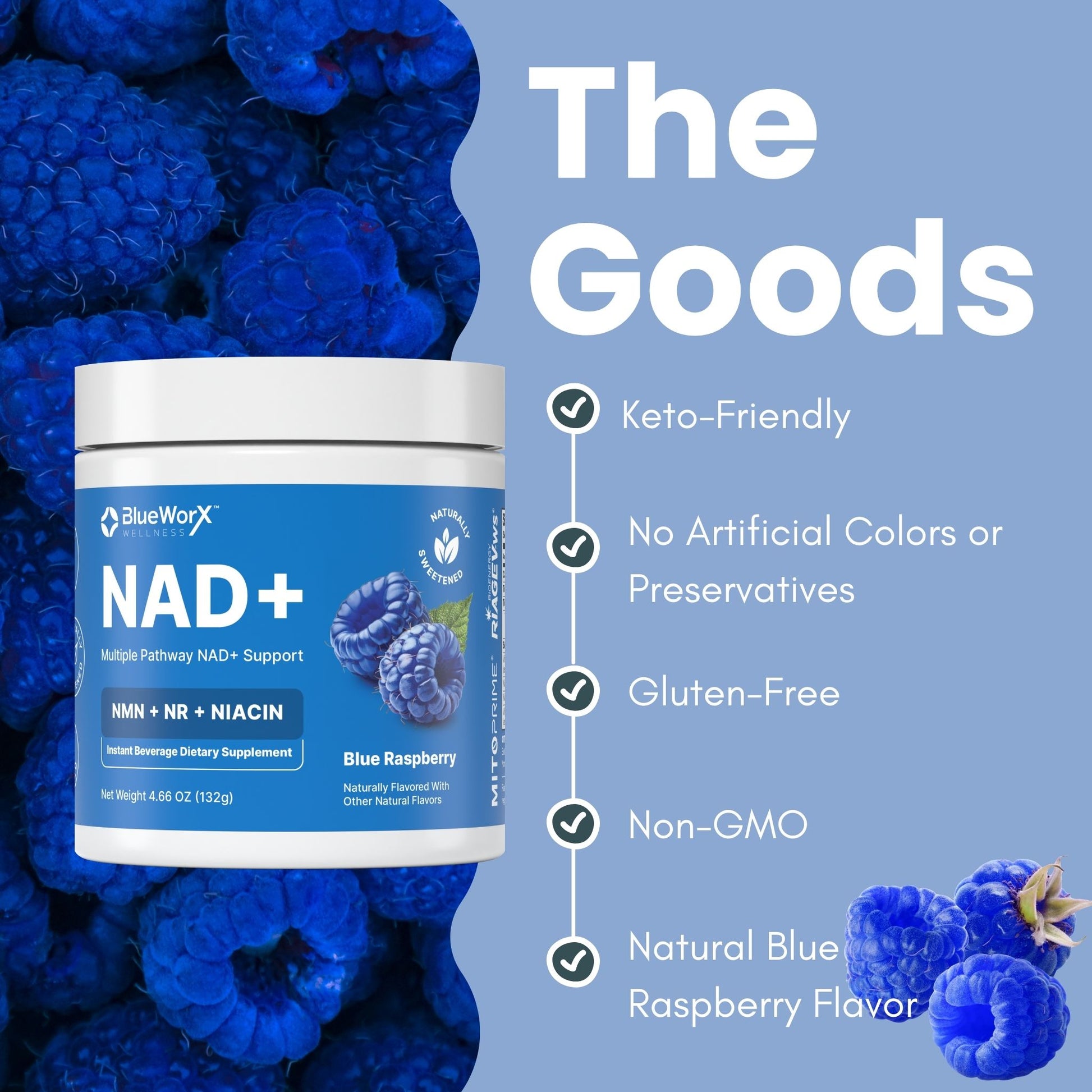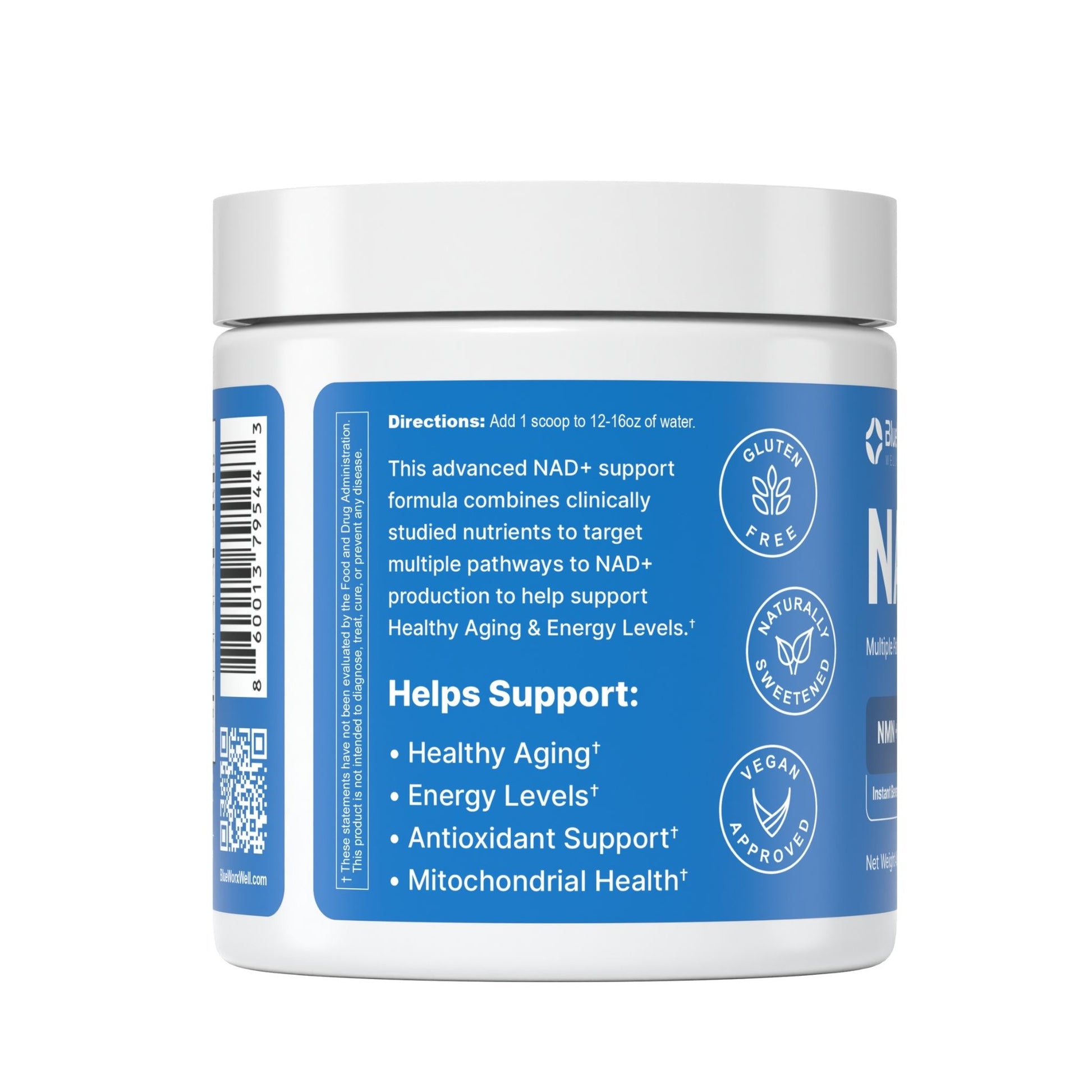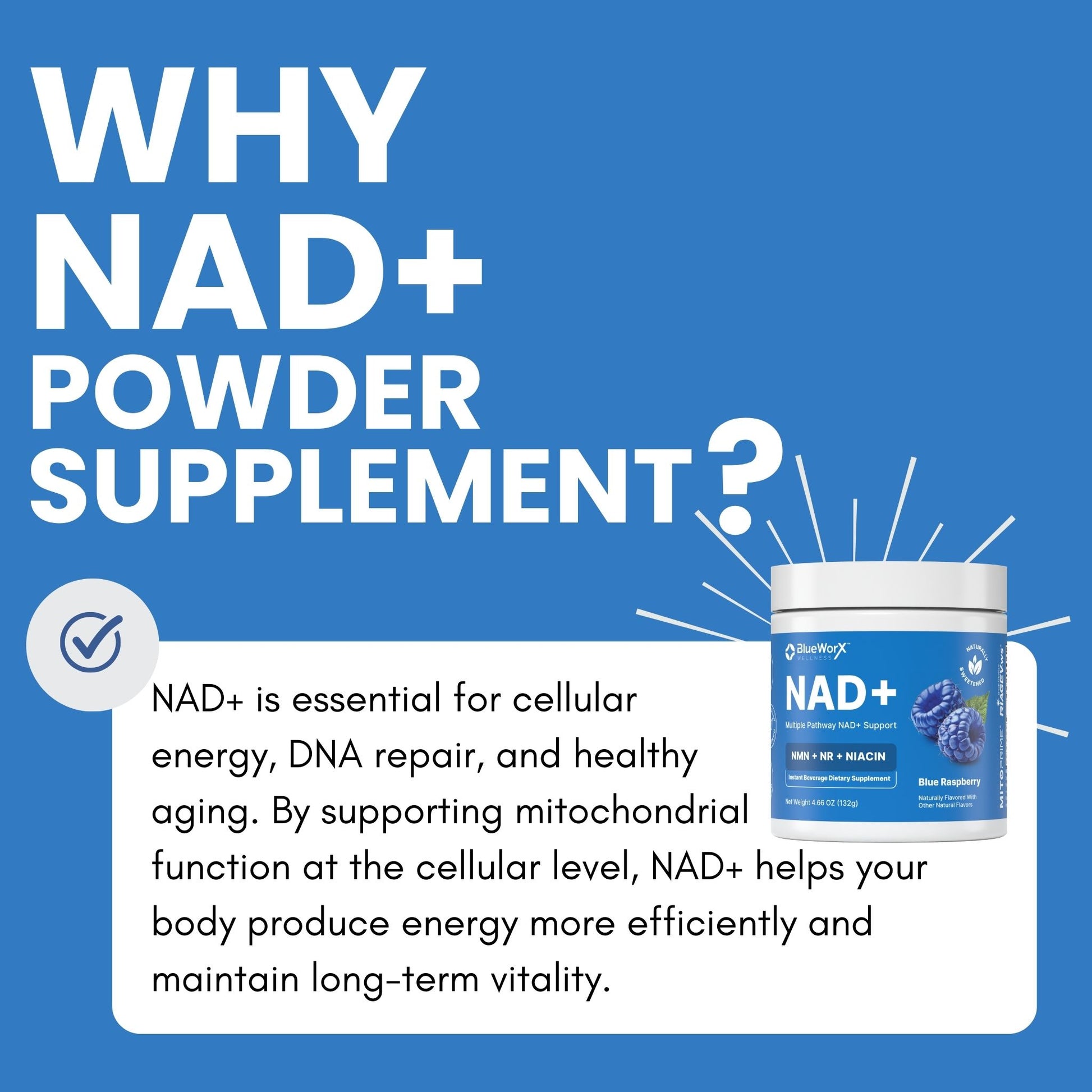 Blueworx NAD+ Powder is formulated to replenish NAD+ through multiple biological pathways, ensuring optimal absorption and effectiveness. By combining NMN, NR, and Niacin, this formula supports the body’s natural ability to produce and recycle NAD+ — helping you feel energized, focused, and resilient.