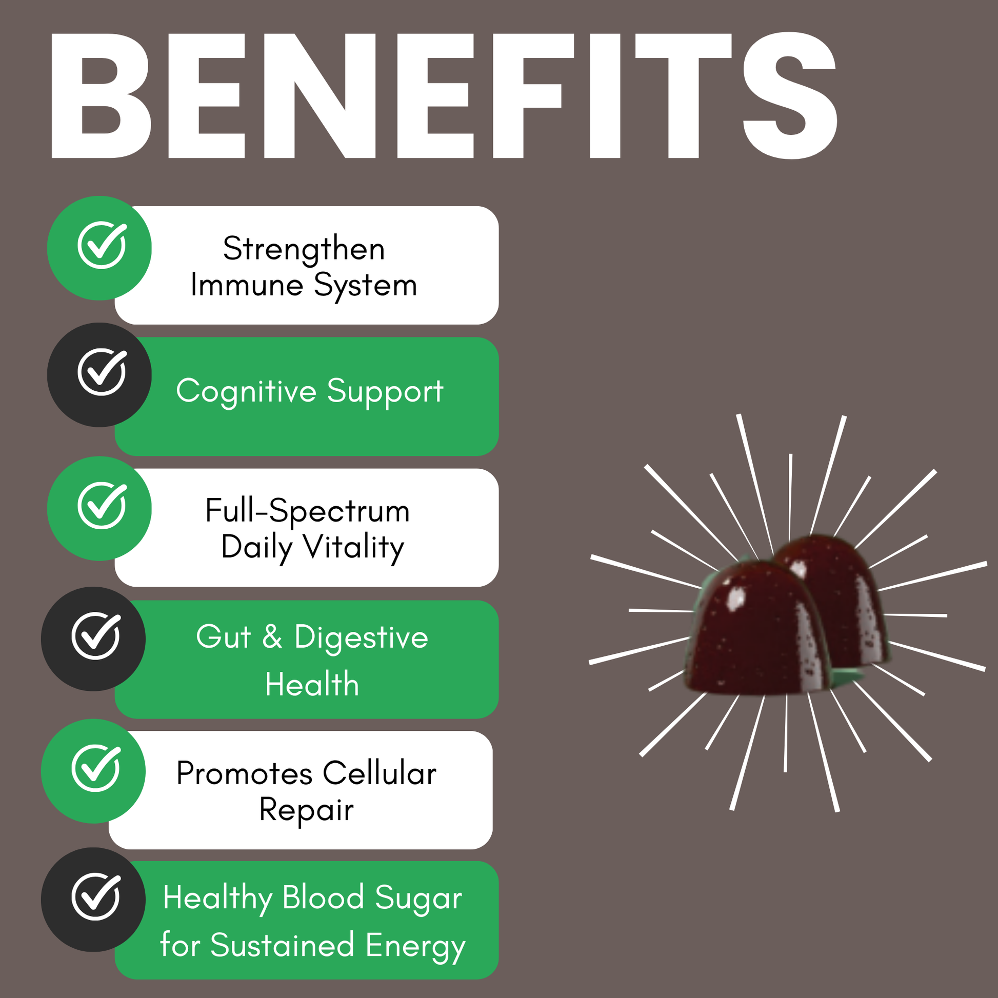 - Reishi Mushroom provides immune-modulating Beta-Glucans and adaptogenic benefits that support overall wellness and longevity.