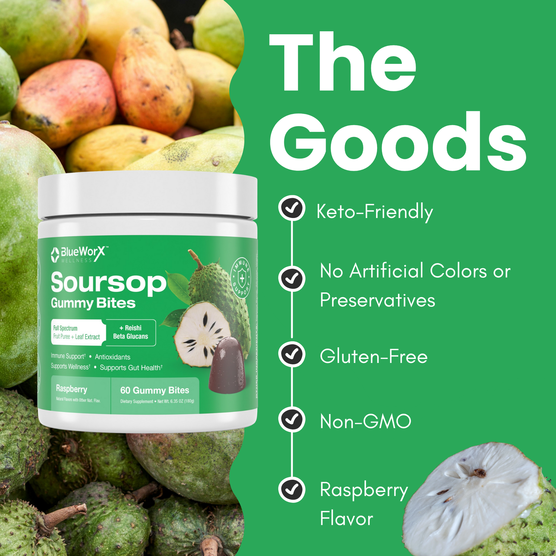 Blueworx Full Spectrum Soursop + Reishi Beta-Glucan Gummies combine two powerhouse superfoods for all-around wellness and immune strength. The unique full-spectrum blend uses both the fruit and leaf of the Soursop plant—capturing the essential vitamins, minerals, and plant compounds responsible for its exceptional health benefits.